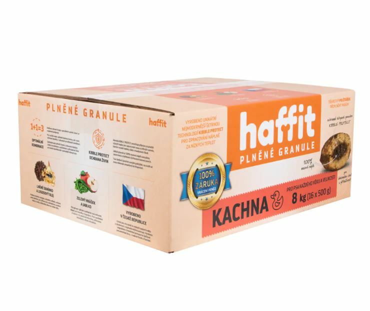 Pro plněné granule HAFFIT je typická chutnost a mimořádně vysoká využitelnost i kompletnost živin. Základem jsou vybrané kvalitní suroviny, převážně živočišné. Unikátní je zpracování technologií KIBBLE PROTECT do třívrstvého polštářku. Hlavní součást granule (66 %) je masová náplň zpracovaná za nižších teplot, aby se horkem nenarušila hodnota a využitelnost živin. Maso je ochráněno dobře propečenou křupavou vrstvou a opatřeno vrchní vrstvičkou s bylinkami. KIBBLE PROTECT – ochrana živin.