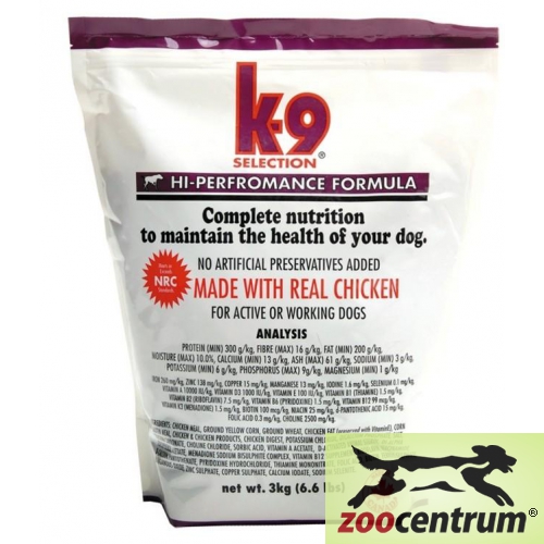 Více než 60% obsahu v sušině je tvořeno kuřecími produkty, které jsou velmi dobře stravitelné a mají vysokou výživnou hodnotu. Díky tomu krmivo poskytuje psovi dostatečný přísun energie a udržuje ho v kondici a celkově dobrém zdravotním stavu. Pomocí K-9 Hi Performance dosáhnete u psa vrcholné tělesné kondice, plné síly a špičkových výkonů, v přípravě na výstavu také nejlepší kvality srsti.