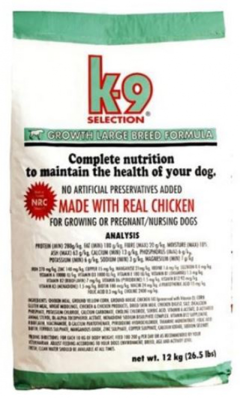 K-9 Selection Growth Large Breed je speciální kompletní výživa pro štěňata a rychle rostoucí psy velkých plemen. Krmivo je také vhodné pro přikrmování ještě kojených štěňat, a to od věku 3 týdnů. Umožňuje kontrolu růstu, minimalizuje nebezpečí kloubních potíží a nedostatečného vývinu kostí. Hodí se i pro březí a kojící feny. Je vyrobeno z kuřat, proto je velmi lehce stravitelné, výživné a chutné. Lze ho podávat také dospělým psům velkých plemen trpícím nechutenstvím, těm povzbuzuje chuť k jídlu a dochází tak ke zlepšení jejich kondice.