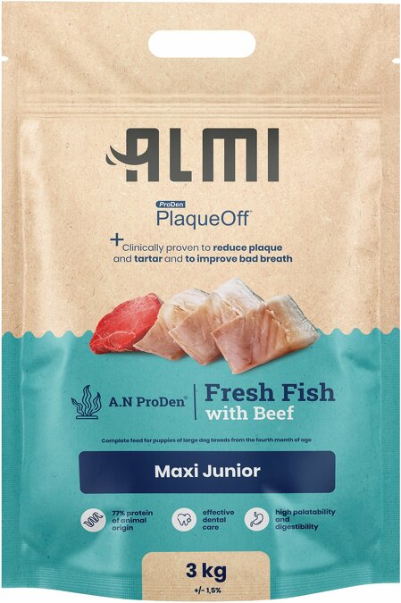 Granule ALMI obsahují vysoký podíl čerstvého rybího a hovězího masa, které zajistí dostatečný přísun bílkovin potřebných pro růst a vývoj štěňat. Ryby jsou navíc zdrojem omega-3 mastných kyselin důležitých pro zdravou kůži a srst psů. Dále je v krmivu rýže pro lepší stravitelnost, jablka či hrách. Zkrátka vše, co Váš pes potřebuje, aby prospíval. Granule ALMI jsou obohacené o PlaqueOff™, u kterého je klinicky prokázáno, že snižuje zubní plak, zubní kámen a zlepšuje špatný dech.