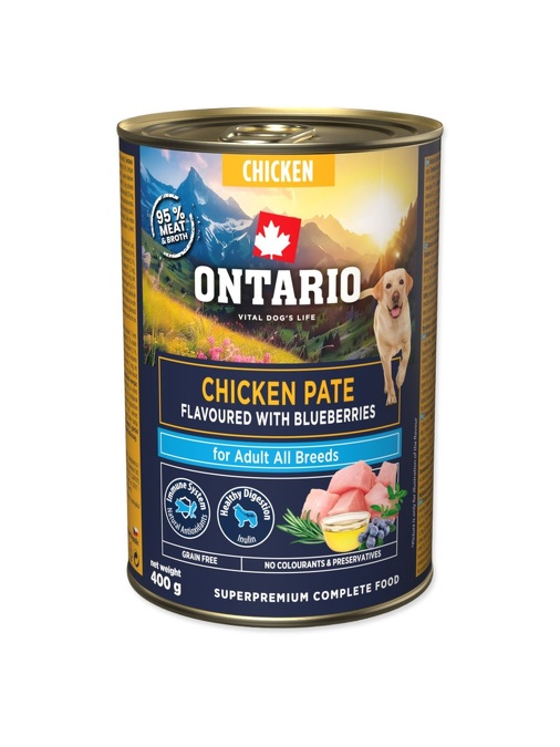 Ontario konzerva Adult kuřecí paté s příchutí borůvek je kompletní krmivo v konzervě určené pro dospělé psy všech plemen. Kuřecí s příchutí bůrůvek.